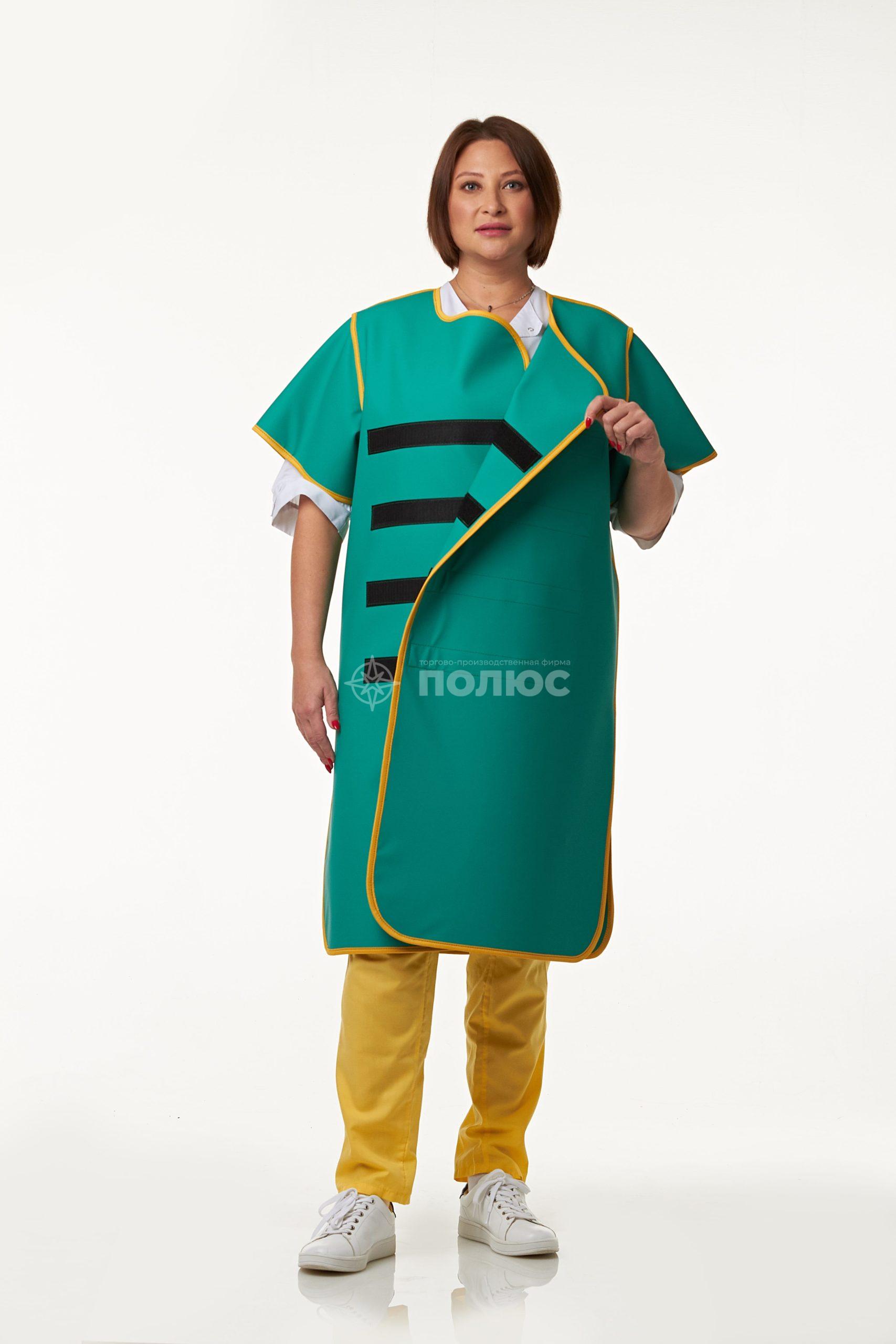 Халат рентгенозащитный — длинная защитная одежда с рукавами, закрывающая корпус, плечи и руки. Применяется в интервенционных и операционных, где требуется максимальная защита тела от рассеянного рентгеновского излучения.