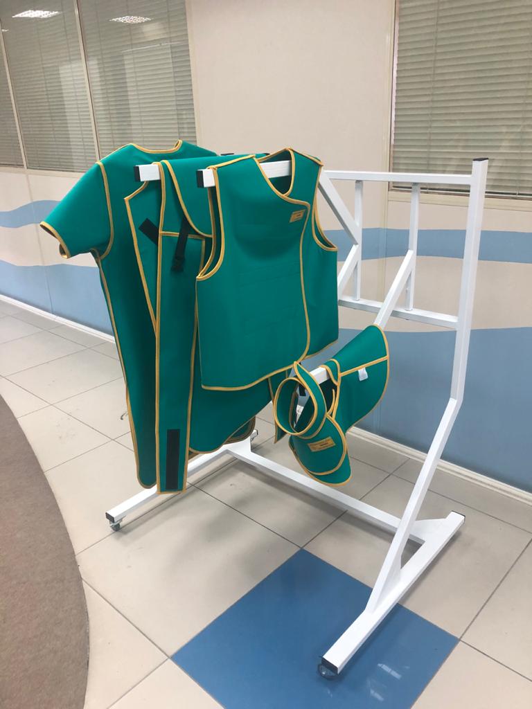 Вешалки мобильные для рентгенозащитной одежды — передвижная стойка на колёсах для хранения и перевозки фартуков, юбок, воротников между процедурными и помещениями подготовки персонала.